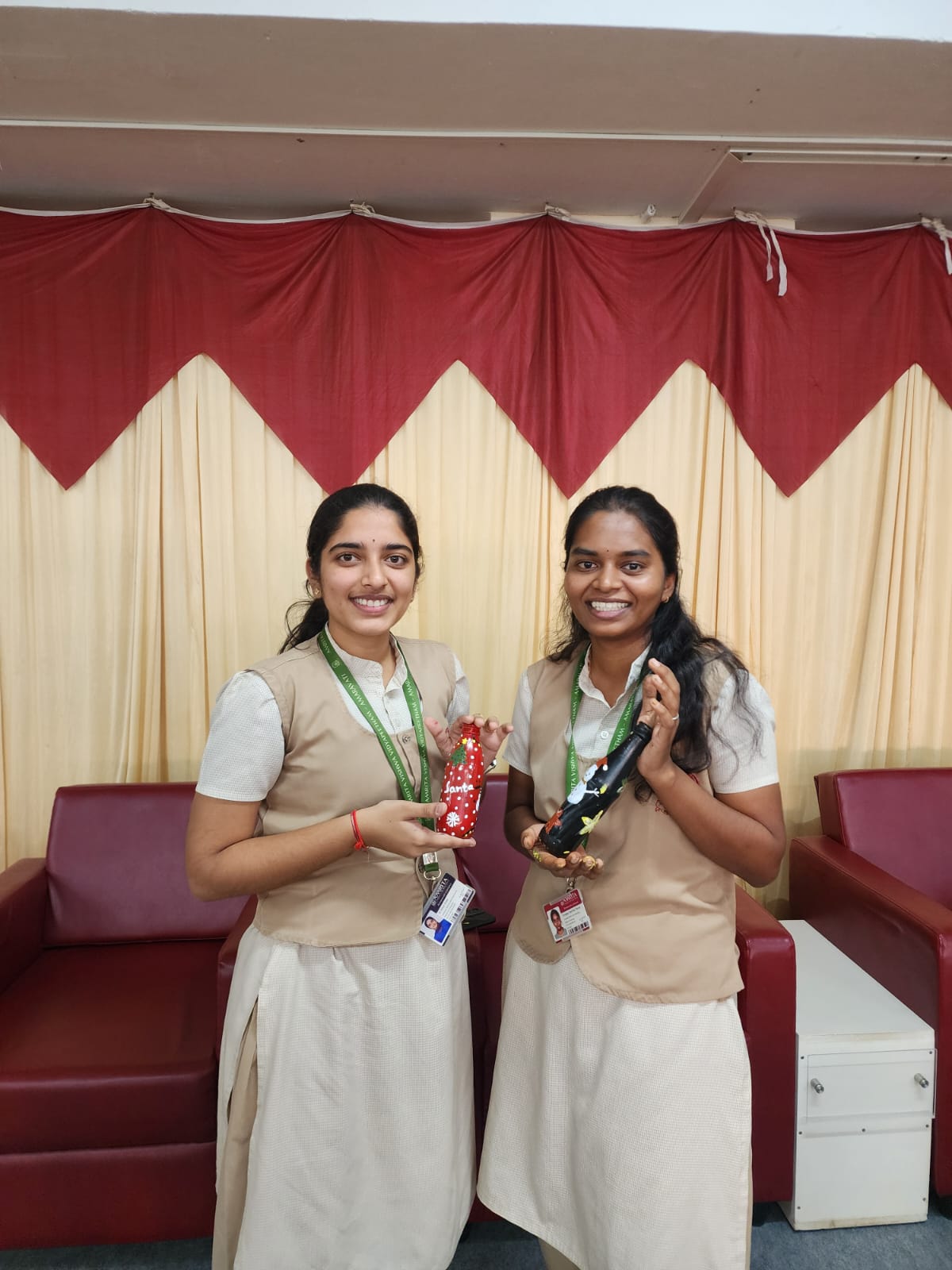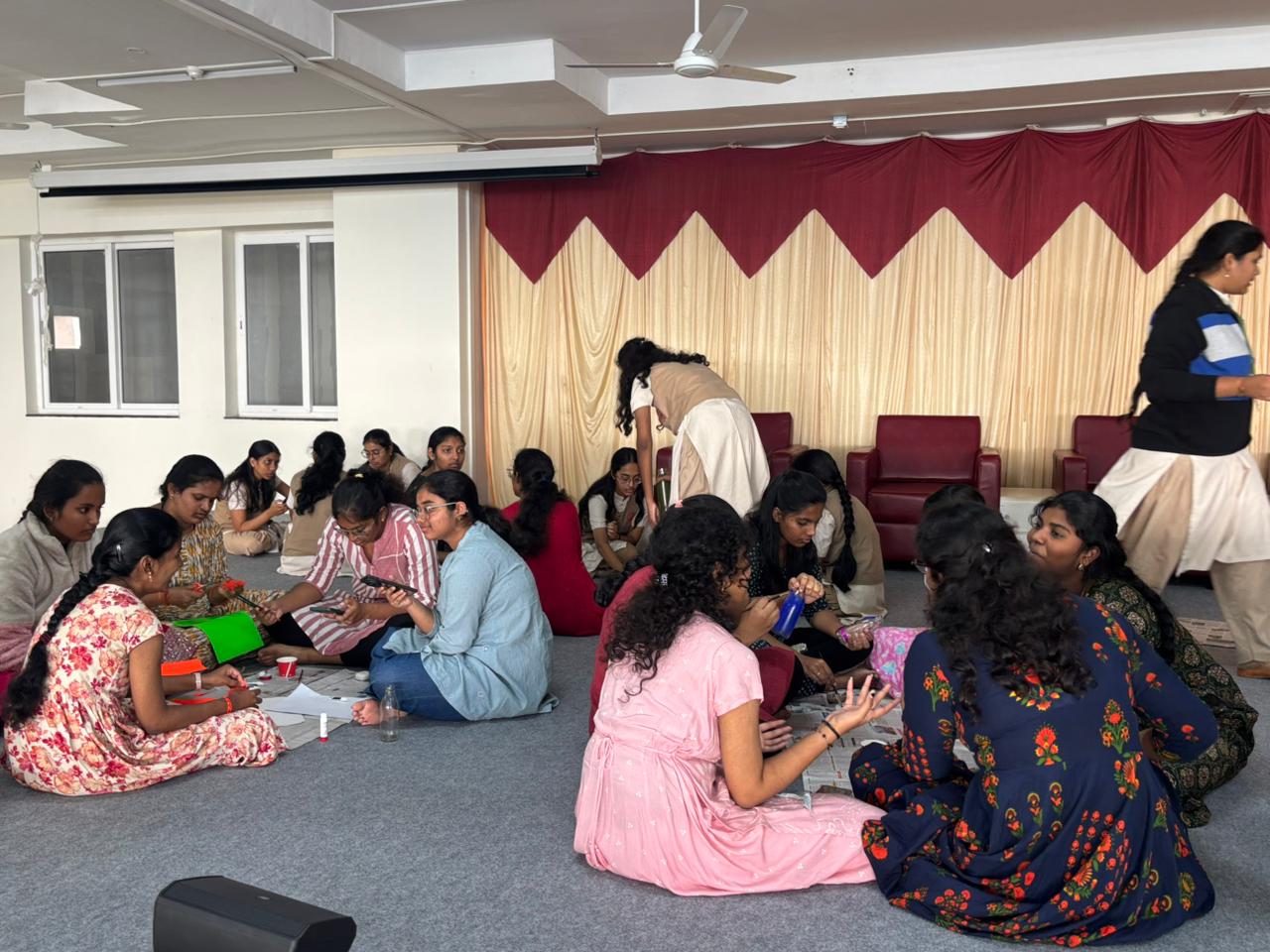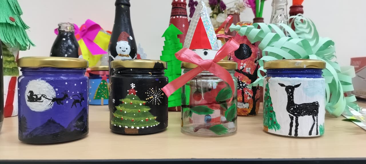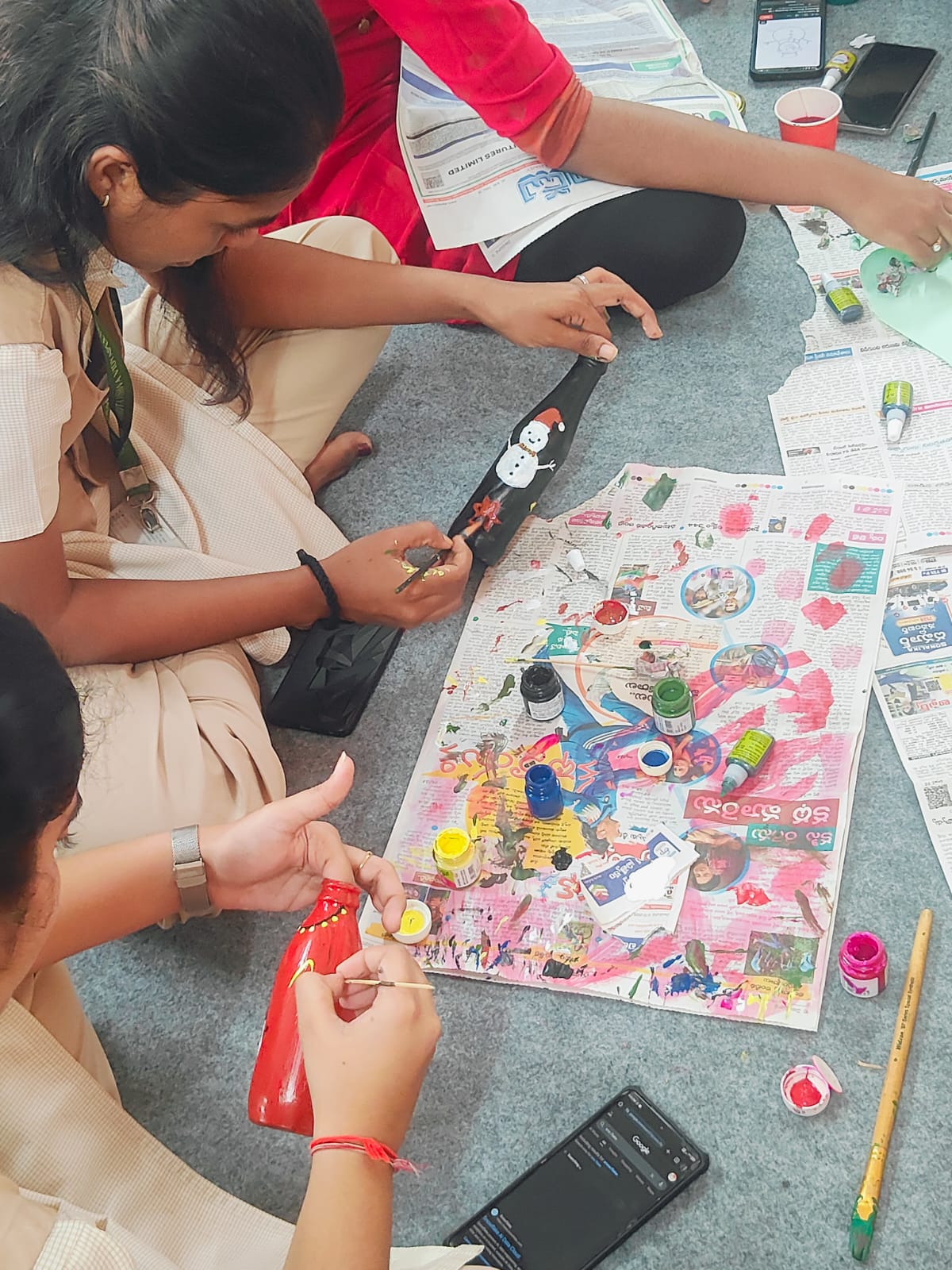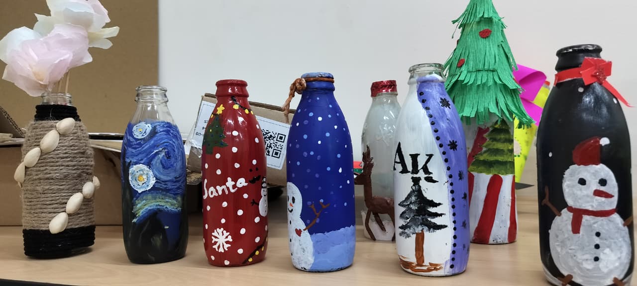 Tint & Twist – A Creative Bottle & Paper Craft Session Conducted by Advika Club : Students engaged in a creative art and craft activity, painting and decorating glass bottles using vibrant colours. The session encourages creativity, teamwork, and hands-on learning through recycled craft materials and colourful paper cut-outs, glue, paint and simple tools. crafts encourage fine motor skills, and teamwork as different shapes are cut, folded, and assembled to form artistic designs. It also promotes focus, imagination, and joyful collaboration in a relaxed and engaging environment.